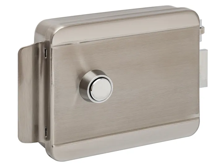Электромеханический накладной замок, НЗ, универсальный, цилиндр снаружи, кнопка изнутри, 12 В, 3 А, -30…+50 °C, 120х102х35 мм, нержавеющая сталь