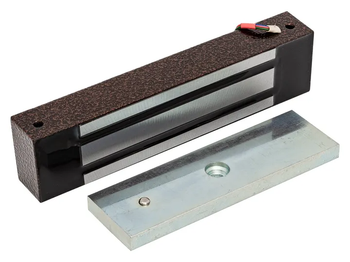 Электромагнитный влагозащищенный замок; удержание 400 кг; IP67; 11,5…14,5 В; 500 мА; датчик Холла; материал корпуса металл; механический компенсатор устранения эффекта остаточной намагниченности на якоре замка; -40…+40°C; масса 3280 г; 220х52х32 мм; цвет: коричневый; уголок в комплекте