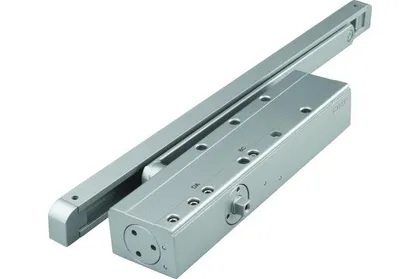 Доводчик со скользящей тягой для дверей весом до 85 кг, двухскоростной, габариты 46х235х63 мм, цвет — серебро