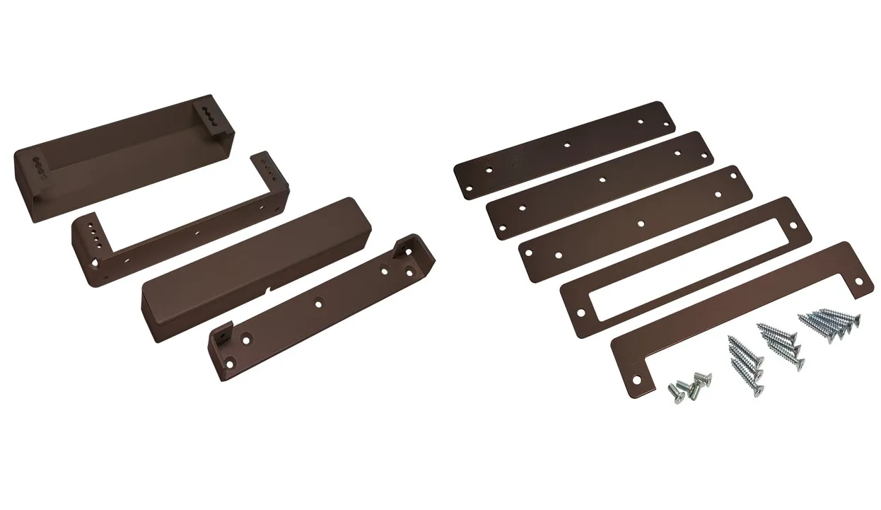 Монтажный комплект для установки замка ALM-700S в накладном варианте, с возможностью регулировки положения якоря относительно кронштейна корпуса замка от 0 до 23 мм. Цвет: коричневый.