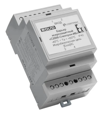 устройств с видом взрывозащиты «искробезопасная цепь (i); [Exia]IIC; U-max.15.5 В, I-вых.140 мА (max); IP42, t-раб.-40…+60°С, 91х54х57 мм. Пластиковый корпус с креплением на DIN-рейку.
