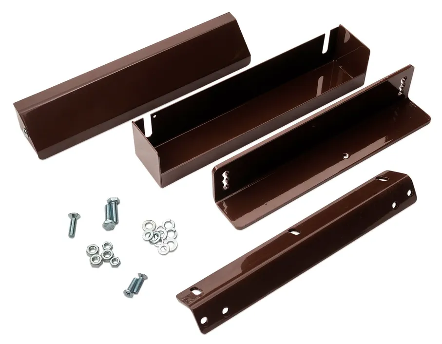 Комплект монтажа для крепления замков AL-200PR на дверях, открывающихся вовнутрь. Комплект монтажа состоит из уголка корпуса, уголка якоря, кронштейна, кожуха, кожуха кронштейна и элементов крепежа.