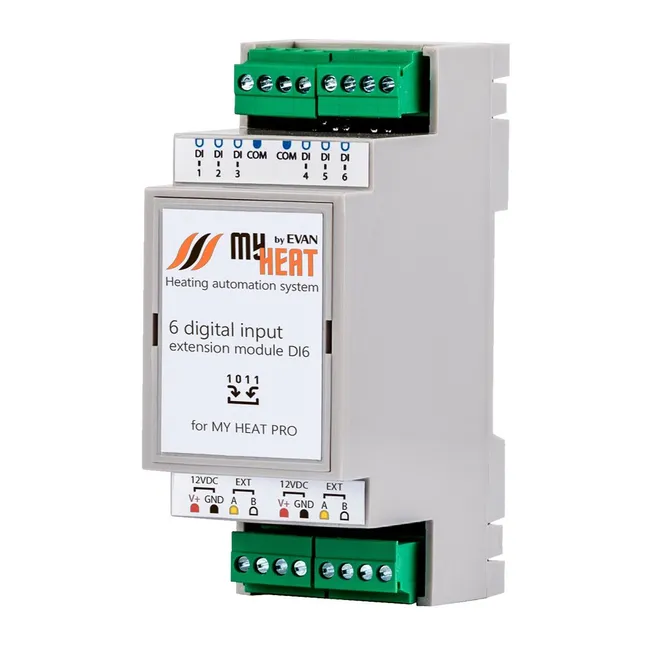 Модуль расширения дискретный проводной; 6 входов 12 В; RS-485; U-управ.9…12 В, P-потр.2 Вт; 36×90.2×57.8 мм. Корпус для установки на DIN рейку.