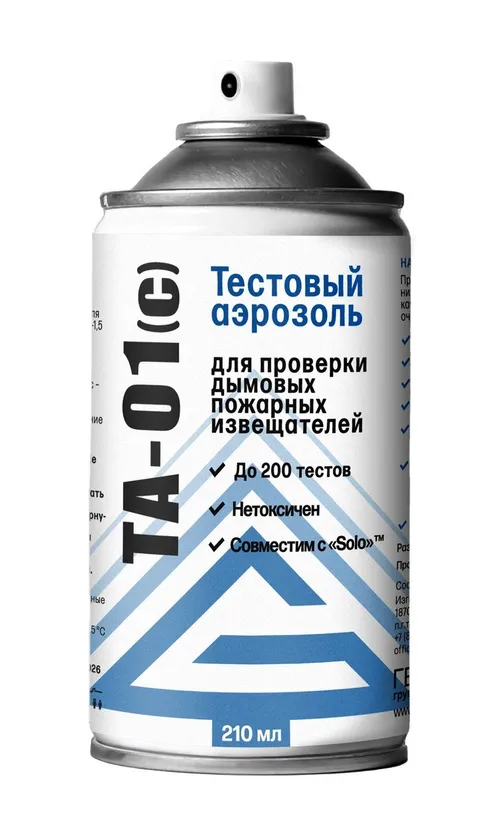 Аэрозоль для проверки дымовых извещателей; негорючий, для ручного распыления, обеспечивает до 200 тестов, совместим с диспенсерами и устройствами распыления типа «Solo»™ 330/332 Aerosol Dispenser, объем баллона 210 мл, габ.размеры Ø52х145 мм
