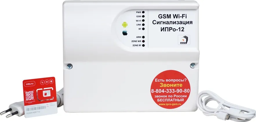 Прибор приемно-контрольный с GSM и Wi-Fi коммуникаторами, 2 SIM (2G); 12 проводных ШС, 10 беспроводных ШС (до 6 извещателей на одну зону); встроенный датчик температуры; до 10 беспроводных пультов; один релейный выход НЗ/НР, U-коммут.220 В, I-коммут.10 А; до 10 беспроводных выходов; вход TouchMemory; до 5 номеров оповещения; miscroUSB; U-пит.220 В, под АКБ 12 В 2.2Ач ; IP20, t-раб.-30…+55°C, 197х164х60 мм. В комплекте SIM-карта МТС.