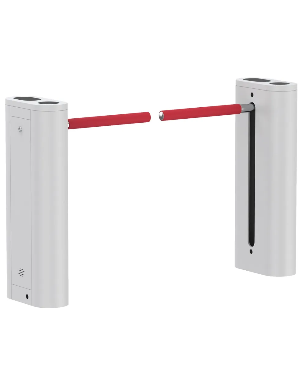 Скоростной турникет серии БС с автоматической штангой «Антипаника» и встроенными считывателями Mifare, IP54, ширина прохода 575 (1170) мм, пропускная способность 25-30 чел/мин, 100-240 В, 40Вт, сухой контакт, материал корпуса — металл, -20…+70°С, внешние габариты 1530х390х970 мм