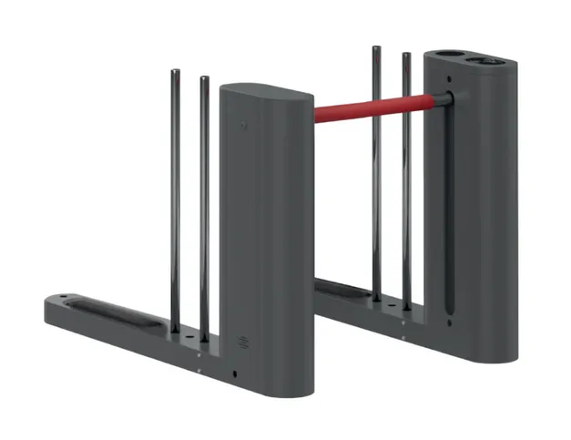 Скоростной турникет серии БС с автоматической штангой «Антипаника» и встроенными считывателями Mifare, IP54, ширина прохода 575 (1170) мм, пропускная способность 25-30 чел/мин, 100-240 В, 40Вт, сухой контакт, материал корпуса — металл, -20…+50°С, внешние габариты 1530х390х970 мм