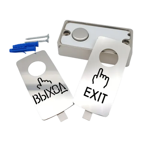 Кнопка выхода, накладная. Антивандальная механическая нормально разомкнутая кнопка (НР). Подсветка контура и нажимной части белого цвета. Материал — нержавеющая сталь, алюминиевый сплав с анодированным покрытием. Нажимная часть из полированной нержавеющей стали. Длина провода 2м. Максимально коммутируемый ток 1А при напряжении 36В. Питание подсветки +12В при потреблении 10мА, 40х80х19 мм. 2 пластины в комплекте с надписью Exit и Выход.