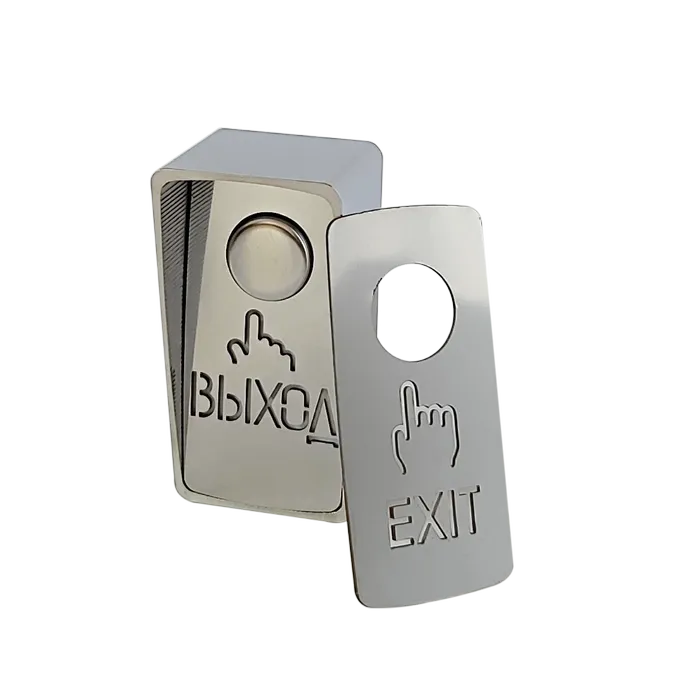 Кнопка выхода, накладная. Антивандальная механическая нормально разомкнутая кнопка (НР). Подсветка контура и нажимной части белого цвета. Материал — нержавеющая сталь, алюминиевый сплав с анодированным покрытием. Нажимная часть из полированной нержавеющей стали. Длина провода 2м. Коммутируемый ток 1А при напряжении 36В. Питание подсветки +12В при потреблении 10мА, 40х80х40 мм. 2 пластины в комплекте с надписью Exit и Выход.