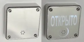 Светозвуковой оповещатель «ОТКРЫТО», для применения в составе СКУД; светодиодная подсветка, U-пит. 12 В, I-потр. ≤40 мА; t-раб.-25…+50°C, уличное, влагозащищенное исполнение; габ.размеры 40х40х12 мм; анодированный алюминиевый сплав, акрил. Цвет «зеркальный хром».