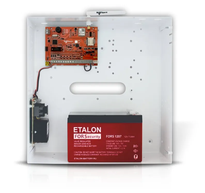 Прибор охранно-пожарный приемно-контрольный с встроенным GSM коммуникатором; 4 ШС (до 8 ШС в режиме удвоения); до 32-х NV TEMP; до 16 клавиатур; 4 выхода, U-вых.12 В, I-вых.300 мА; GPRS/CID UDP/CID SMS/CLIP/CID IP, до 15 номер оповещения; до 64 пользователей; вход ТМ; miniUSB, удаленное программирование NV Online Pro; U-пит. 220 В, под АКБ 12 В 2.2 Ач; 300х300х92 мм. В комплекте: GSM-GPRS передатчик NV 2020; Блок питания NV 7201; NV 2002; Антенна 1-SMA