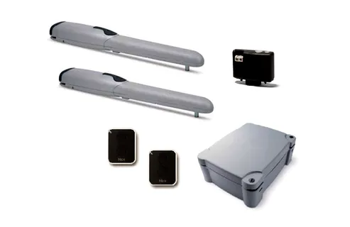Комплект для распашных ворот WINGO4KLT. Состав комплекта: привод WG4000 (2 шт.), приёмник OXIBD (1 шт.), Пульт управления (2 шт.), Блок управления MC800 (1 шт.)