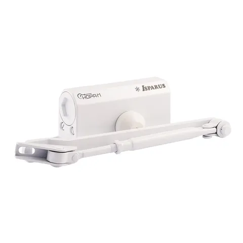 Доводчик с функцией фиксации двери в открытом положении для дверей весом 15 — 60 кг. Класс доводчика EN1-3. двухскоростной, с рычажной тягой, установочный размер 126х19 мм, габариты 142х57х37 мм, -45…+60 °С, цвет — белый.