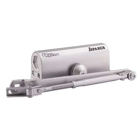 Доводчик для дверей весом 40 — 90 кг, двухскоростной, с рычажной тягой, установочный размер 165х19 мм, габариты 182х62х40 мм, -45…+60 °С, цвет — серебро.