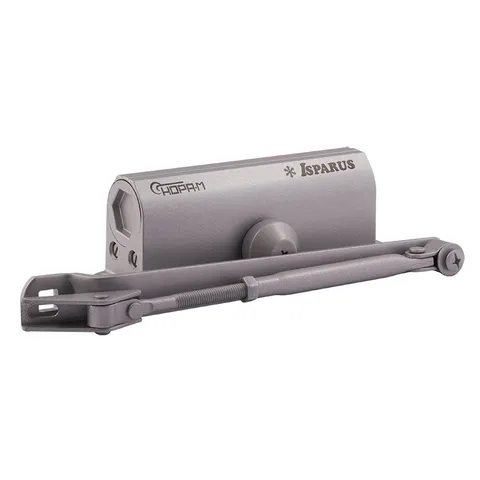 Доводчик для дверей весом 40 — 90 кг, двухскоростной, с рычажной тягой, установочный размер 165х19 мм, габариты 182х62х40 мм, -45…+60 °С, цвет — серый.