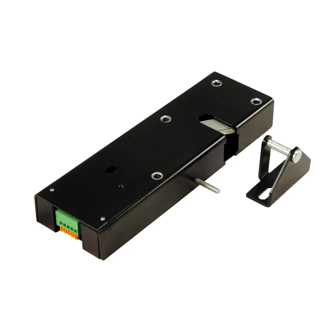 Электромеханический замок с толкателем и датчиком положения двери. Усилие удержания ригеля 500 кг. Нормально закрытый, напряжение питания 12В/0,4А, встроенный датчик состояния замка, замок устанавливается справа (петли двери слева), цвет — черный, 47х154х21 мм.