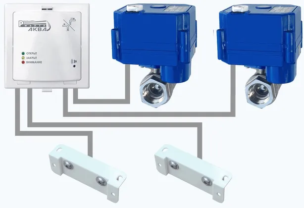 Система автоматического перекрытия водопровода и формирования тревожного извещения при обнаружении утечки воды. В комплекте: блок управления — 1 шт., элементы питания CR123A (3В) — 2шт, датчик протечки воды с кабелем 5 м — 2 шт., кран 1/2″ с электроприводом — 2 шт.