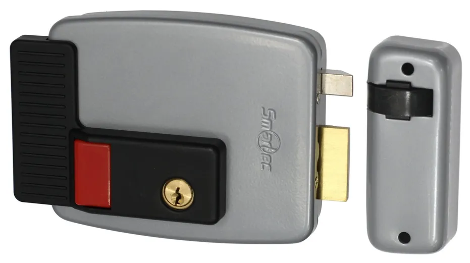 Электромеханический накладной замок, НЗ, левая дверь, цилиндр снаружи и изнутри, кнопка изнутри (блокировка кнопки), питание 12VDC/3.3А, -45°+50°C, окрашенная сталь, 150х106х90 мм.