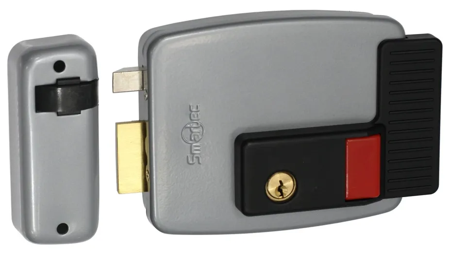 Электромеханический накладной замок, НЗ, правая дверь, цилиндр снаружи и изнутри, кнопка изнутри (блокировка кнопки), питание 12VDC/3.3А, -35°+50°C, окрашенная сталь, 150х106х90 мм.
