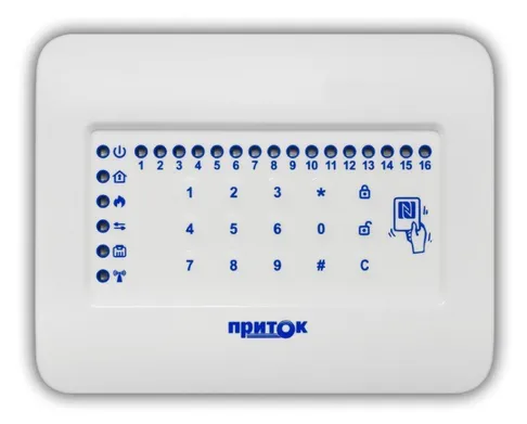 Мембранная клавиатура для работы с приборами Приток-А-КОП на 16 ШС; встроенный считыватель NFC; RS-485, два порта TouchMemory; U-пит.10.2…14.5 В, I-потр.200 мА; t-раб.-10…+45°С, 160х128х32 мм