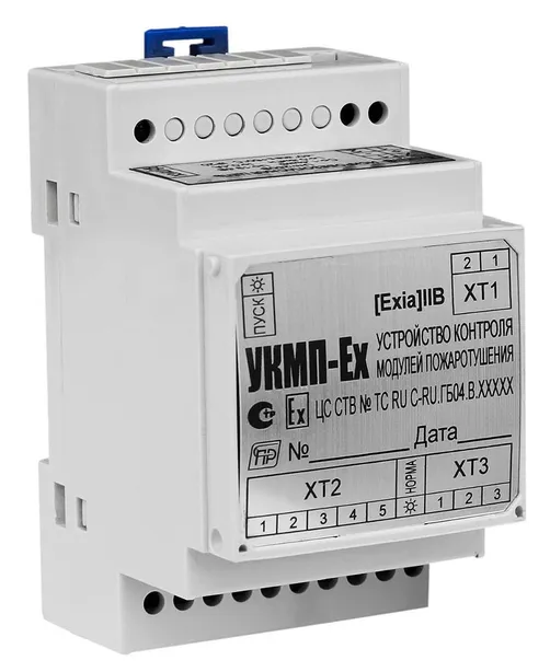 Устройство контроля модулей пожаротушения, диапазон рабочих напряжений 10…36 В, напряжение пусковой цепи в режиме «ПУСК» не более 19 В, ток цепи пуска в режиме ПУСК не менее 1 А, степень защиты оболочкой IP20, диапазон рабочих температур -40…+60°С, габаритные размеры 55х100х65 мм