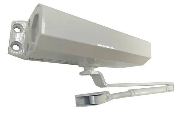 Доводчик дверной для двери весом до 80 кг, рычаг с квадратным отверстием. Монтажные размеры 165х19 мм. Температура застывания гидравлической жидкости: -60°C, рабочий диапазон -50…+60°C. Цвет: белый.